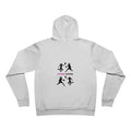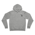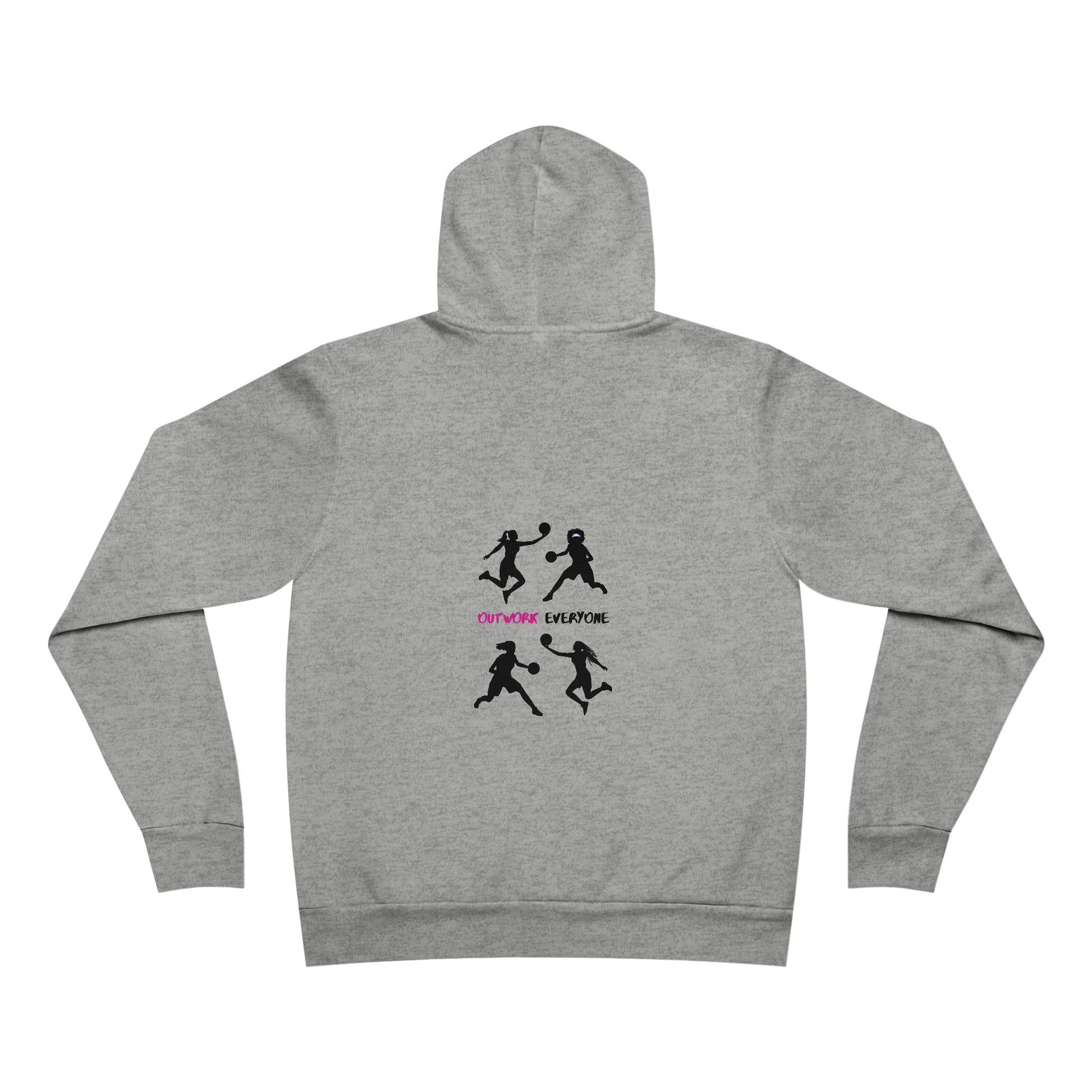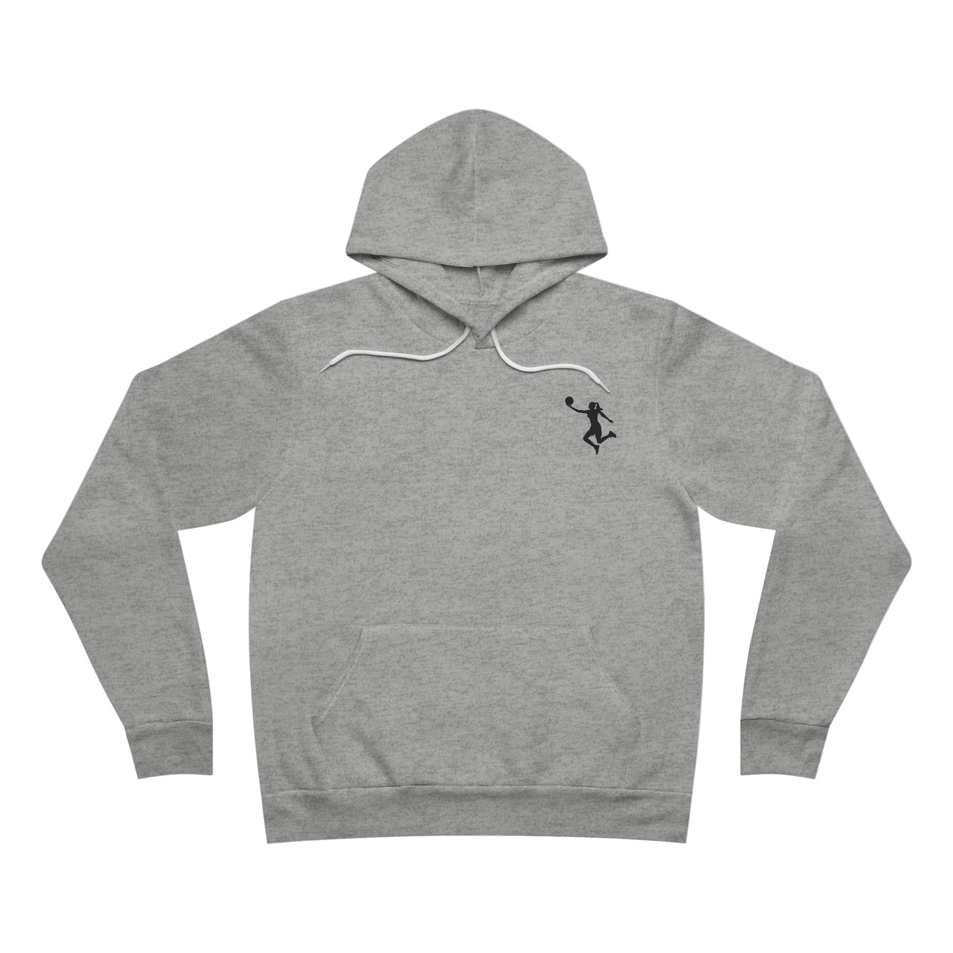 The unisex sponge fleece pullover hoodie is a blend of Airlume cotton and polyester. The percentages vary according to color. A pouch-style pocket spreads across the lower half of the garment’s front. The hood can be tightened with a white drawcord. Both cuffs and waistband have ribbing for extra grip.